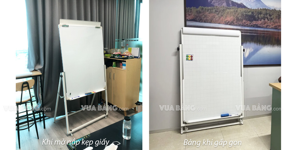 Bảng Flipchart chân gấp khi mở nắp kẹp giấy và khi gấp gọn