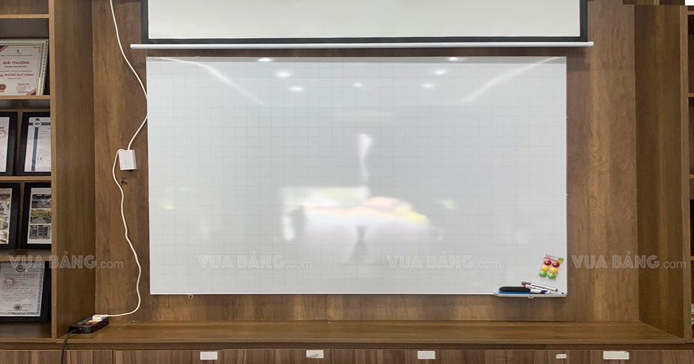 - Mặt bảng: được làm bằng chất liệu thép phủ sơn màu trắng sứ cao cấp, viết bút lông có thể xoá dễ dàng, không bị bay màu hay bong tróc sau nhiều năm sử dụng, có chia thành các dòng kẻ caro 5x5cm (hoặc KHÔNG có dòng kẻ - gọi là bảng trơn), mặt bảng có lực hít nam châm mạnh
