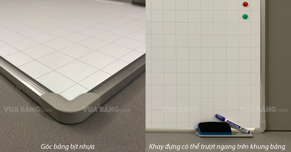 Hình ảnh góc bảng và khay nhựa có thể trượt trên khung bảng