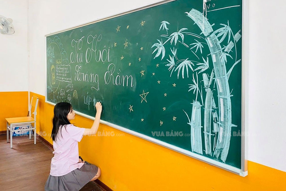 - Mặt bảng: được làm bằng chất liệu thép phủ sơn màu xanh rêu cao cấp, không bị bay màu hay bong tróc sau nhiều năm sử dụng, mặt bảng bám phấn và dễ lau bằng giẻ thông thường